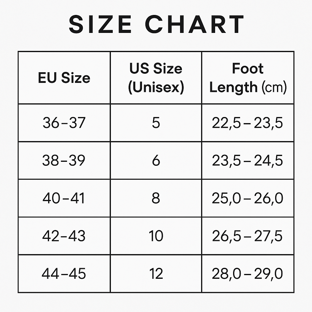 If you're between sizes, we recommend choosing one size up for extra comfort — especially if you wear socks.